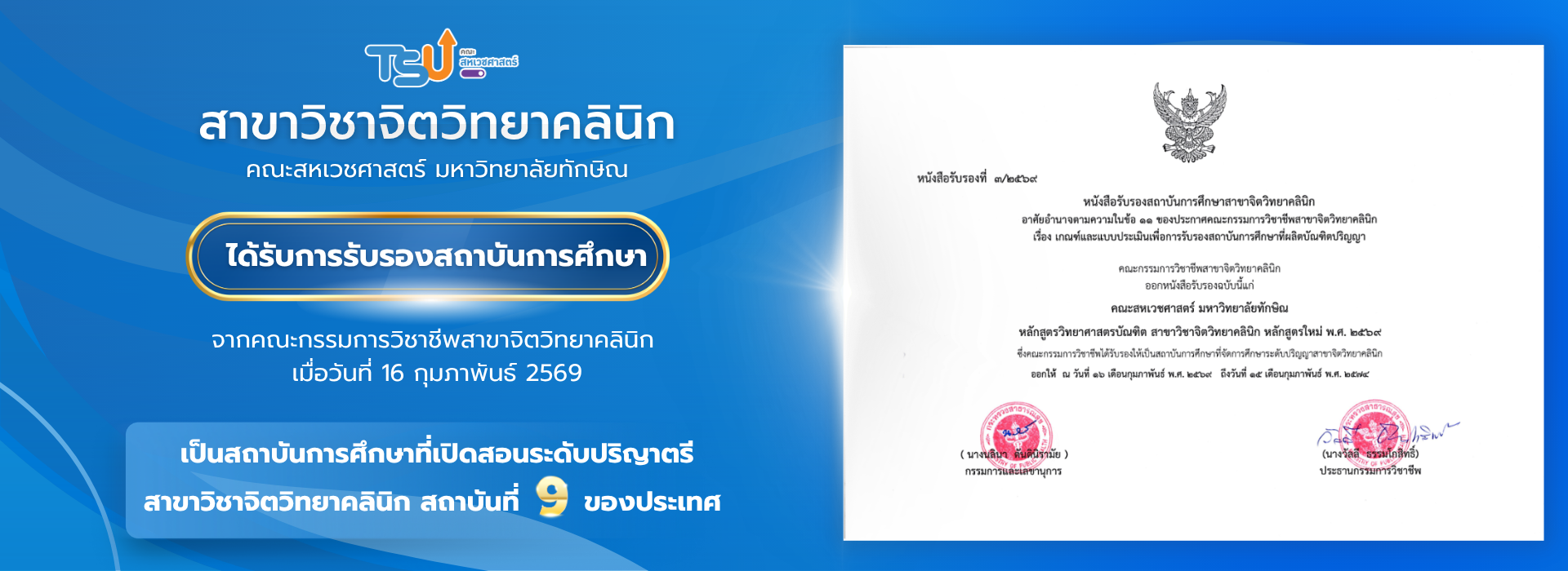 หลักสูตร วท.บ. สาขาวิชาจิตวิทยาคลินิก คณะสหเวชศาสตร์ มหาวิทยาลัยทักษิณ ได้รับการรับรอง